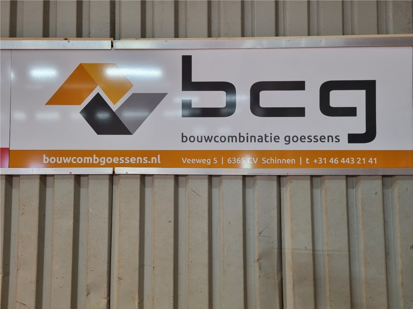 In de tennishal hangt een sponsorbord van Bouwcombinatie Goessens (BCG). BCG is gevestigd op Veeweg 5 in Schinnen. |