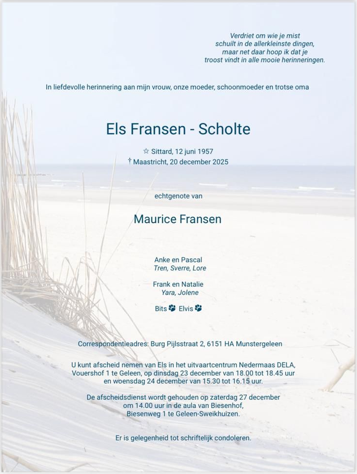 Vandaag heeft ons het droevige bericht bereikt dat ons lid Els Fransen is overleden.